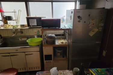 キッチン用品、コップ、レンジラック、冷蔵庫の中身、電子レンジ、オーブントースター、食器棚、椅子、桶、ダイニングセット、大量のゴミ袋、下駄箱、毛布、カラーボックス、靴、傘立て、雑誌、雑貨品、家電、家具、など
