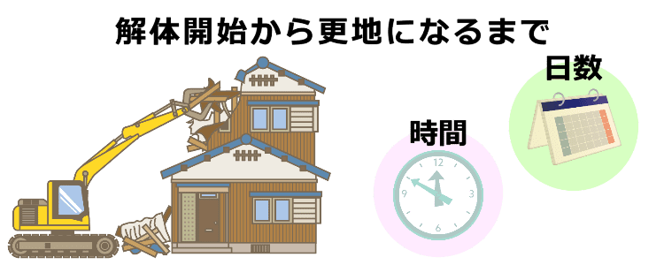 打ち合わせや手続きの時間を除き、重機による家屋解体がスタートしてから更地になるまで、3日〜1週間(実働)の時間がかかります。土地の再活用を早めに検討している方は目安の期間として考慮してください。尚、土地売買に伴う測量に関しましては解体の後半から同時作業にておこなう事も可能です。ご希望の際は、遠慮なくお申し付けください。