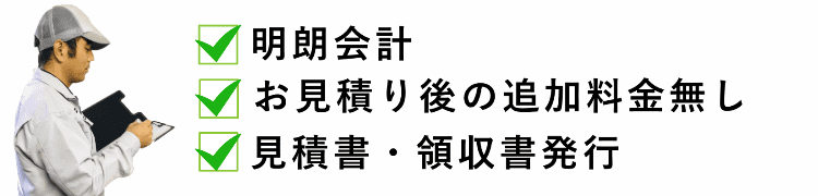概算や見込みお見積りではなく、必ずはっきりとした追加料金なしの正式なお見積りを提示致します。お見積書にはお約束として『追加料金無し』の文言を提示させて頂いております。ただし、追加料金なしのお見積り条件として、現地無料お見積りが必須となりますので、是非お気軽にお問い合わせください。
